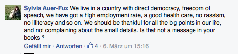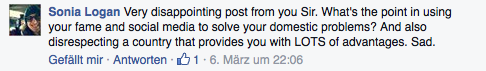 Super message: „Dieses Land und Ihr Status verschaffen Ihnen viele Vorteile. Was DENKEN Sie sich dabei, die auch noch zu benutzen? Ausserdem ist Kritik dasselbe wie Respektlosigkeit. Also stfu.“