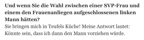 Aaah, wow. Der fragt eine Feministin, ob sie lieber eine Frau wählen würde oder jemanden, der Frauenrechte vertritt. Da hat er sie aber erwischt. Man weiss ja, dass man mit dieser Frage Emanzen bannen kann, so dass sie sich nicht mehr von der Stelle bewegen können. Oder braucht man dafür Weihwasser und einen Kreis aus Salz? Naja, egal. Schockierenderweise entscheidet sich Stamm eher für jemanden, der nicht aktiv anti-feminstische Ziele vertritt. Boah. Die ist sicher gar keine echte Emanze. Jeder weiss, dass das Ziel von Feminismus ist, immer und unter absolut allen Umständen Frauen Männern vorzuziehen. Genau analog zum Inländervorrang. Ganz egal, ob man den eigenen Zweck damit um Jahre zurückwirft.