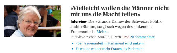 Ich versteh ja, dass nicht jeder feministisch bewandert ist. Wobei man von einem Redakteur beim Tagesanzeiger eventuell erwarten könnte, dass er sich für ein Interview so gut vorbereitet, dass er zumindest Kommentare über Frauen und Shopping unterdrücken kann. Eine Frau wie Judith Stamm hätte sicher einige interessante Dinge zu erzählen gehabt, wenn Soukup sie nicht mit seinen unsinnigen Fragen davon abgehalten hätte.