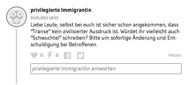 Natürlich ist dieser abscheuliche Beitrag hauptsächlich dem mangelnden Anstand von Simone Meier zu verdanken. Allerdings ist es schon auffällig, dass sich kein Protest feststellen lässt. Keiner der Kommentarschreiberlinge stösst sich an diesen extrem transphobischen und verächtlichen Bemerkungen. Lieber wird über die beschriebenen Personen gespöttelt. Genau deshalb ist Transphobie unser aller Problem. Solange es sein kann, dass ein bekanntes Online-Portal es völlig in Ordnung findet, so etwas zu veröffentlichen, müssen wir alle wachsam sein und die Augen offen halten. Und vor allem Einspruch erheben. Gerade Cismenschen sind hier in der Pflicht, sich gegen Angriffe auch verbaler Natur einzusetzen, da wir uns dabei nicht exponieren und gefährden. Es kann nicht den Betroffenen überlassen werden, sich vor solchen Abscheulichkeiten zu beschützen.