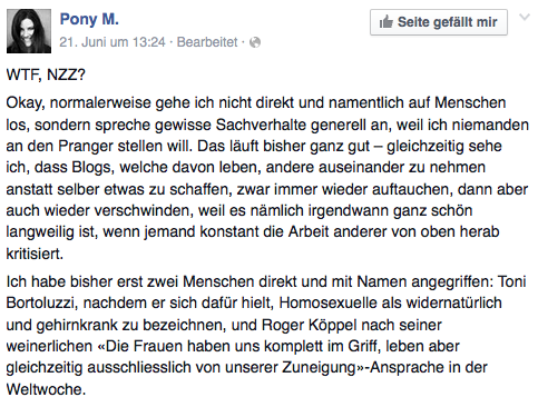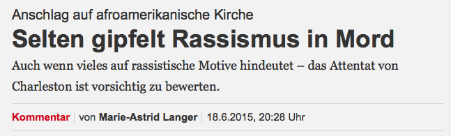 Über dieses Machwerk von NZZ-Journalistin Marie-Astrid Langer haben sich bisher schon einige mehr als zurecht aufgeregt, und das auch sehr ausgiebig. Wie Langer auf die absolut schwachsinnige Aussage kam, Rassismus führe selten zu Mord und überhaupt liesse sich ja schwer sagen, und hate crimes wären ja eh mehr so ein Nischenphänomen, bleibt wohl für immer ein Rätsel. Wo hier die Verantwortung der Redaktion blieb, fragt sich unter anderem Yonni Meyer, aka Pony M. Obwohl Meyer es anscheinend grundsätzlich ablehnt, die Arbeit anderer zu kritisieren, weil das ja schliesslich von oben herab ist und keine Arbeit und sicher nicht nützlich für irgendwas ist, irgendetwas in Frage zu stellen, hat sie sich an dieser Stelle erbarmt und eine sehr ausführliche und, wie ich meine, umfassende Kritik verfasst, die hier nachzulesen ist.