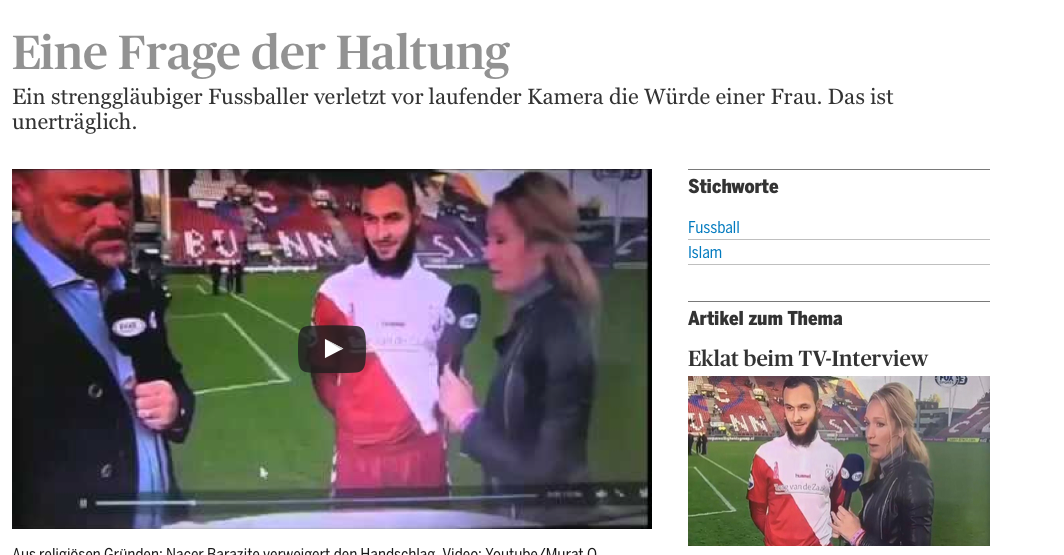 Okay, das klingt jetzt etwas antiklimatisch. Nach so einer Schlagzeile erwartet man ja eigentlich schon, dass er sie mindestens begrabscht oder wenigstens doch zu steinigen versucht hat. Aber glaubt mir; dieser verweigerte Handschlag, der schlägt dem Fass den Boden aus. Da lässt man diese Ausländer ins Land, gibt ihnen Jobs als Fussballspieler und dann weigern sie sich einfach, ihnen unbekannten Frauen die Hand zu schütteln, um ihr nicht zu nahe zu treten.