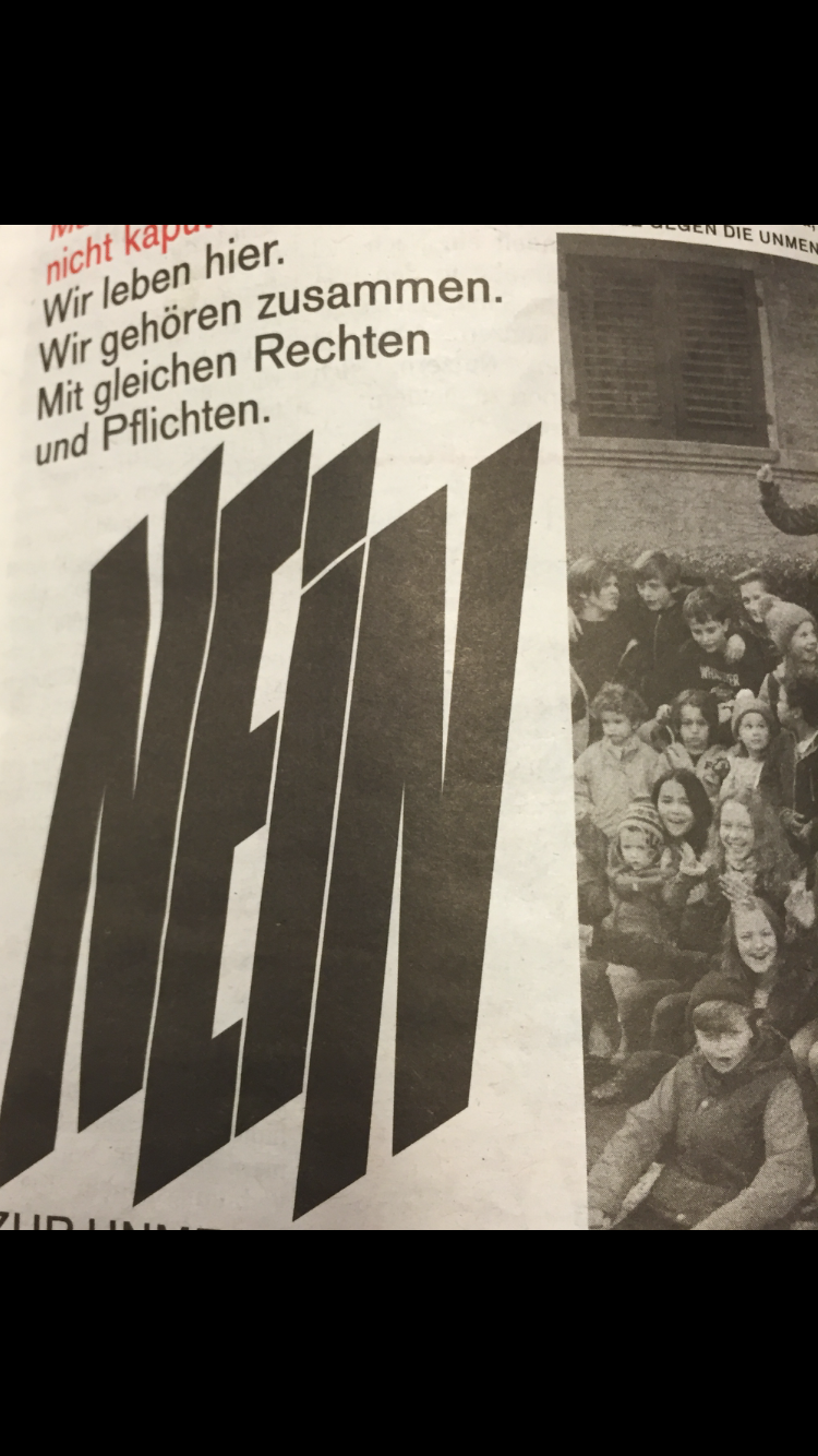 - Auf dem Weg zur Arbeit fiel mir heute morgen eine Anzeige auf. In runenartiger schwarzer Schrift stand dort gross das Wort NEIN. Daneben eine Schwarzweissphotographie einer Menschengruppe. Nach einer kurzen Schreckenssekunde erkannte ich das Motiv als Beitrag der DSI-NEIN-Initiative eines Bündnisses diverser Parteien. Tatsächlich hatte ich den Schriftzug in den letzten Tagen wiederholt auf Ansteckbuttons gesehen.